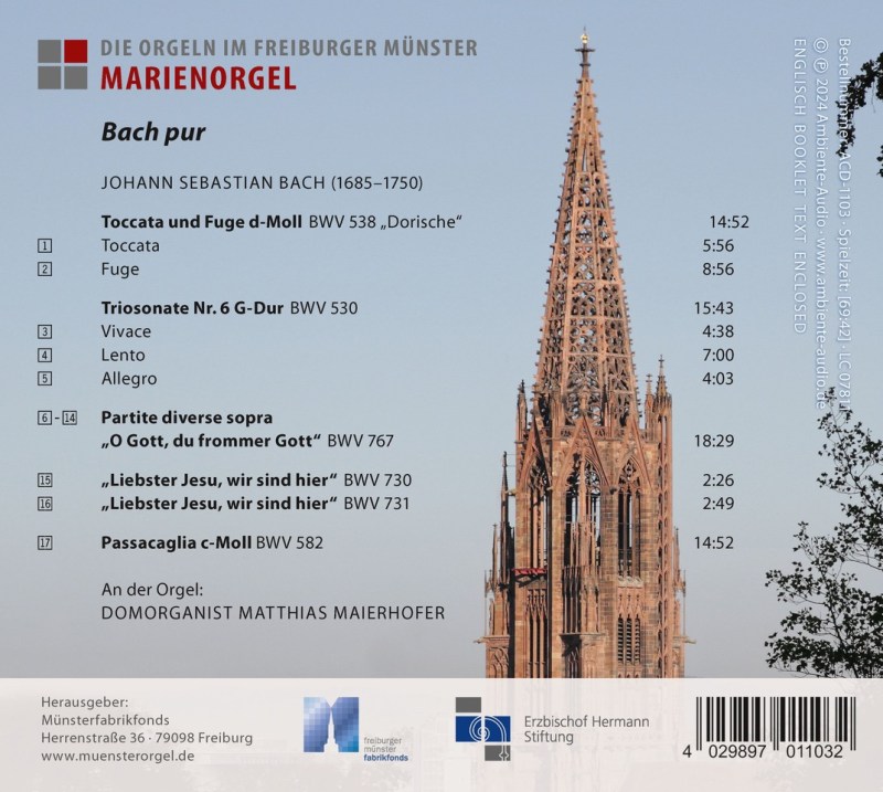 Après avoir enseigné à la Hochschule für Musik und Theater Felix Mendelssohn Bartholdy de Leipzig puis à l’Université d’Austin (Texas), Matthias Maierhofer est depuis 2016 professeur à la Hochschule für Musik de Freiburg, organiste titulaire des orgues du Münster et directeur artistique des Internationale Orgelkonzerte im Freiburger Münster – quinze concerts pour cette saison 2025, entre mi-juin et fin septembre. Enregistrés entre 2019 et 2024 (un CD pour chaque orgue dans un répertoire spécifique avec nombre de raretés, cependant que le cinquième réunit les quatre orgues), ces cinq CD font l’objet d’une double parution, séparément et en coffret – remarquables prises de son signées Toms Spogis.